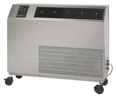 Includes Electronic Touchpad with Digital Readout, Two Speed Fan, 4-way Adjustable Grilles, Stainless Steel Cabinet, 18" Quick-Connect Hose Kit, Condensate Pump, Water Regulating Valve, Heavy Duty Casters