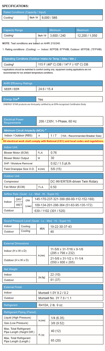 Product Name : Mitsubishi MSY-GL09NA-U1 MUY-GL09NA-U2 Split system SEER 24.6 ENERGY STAR COOL ONLY