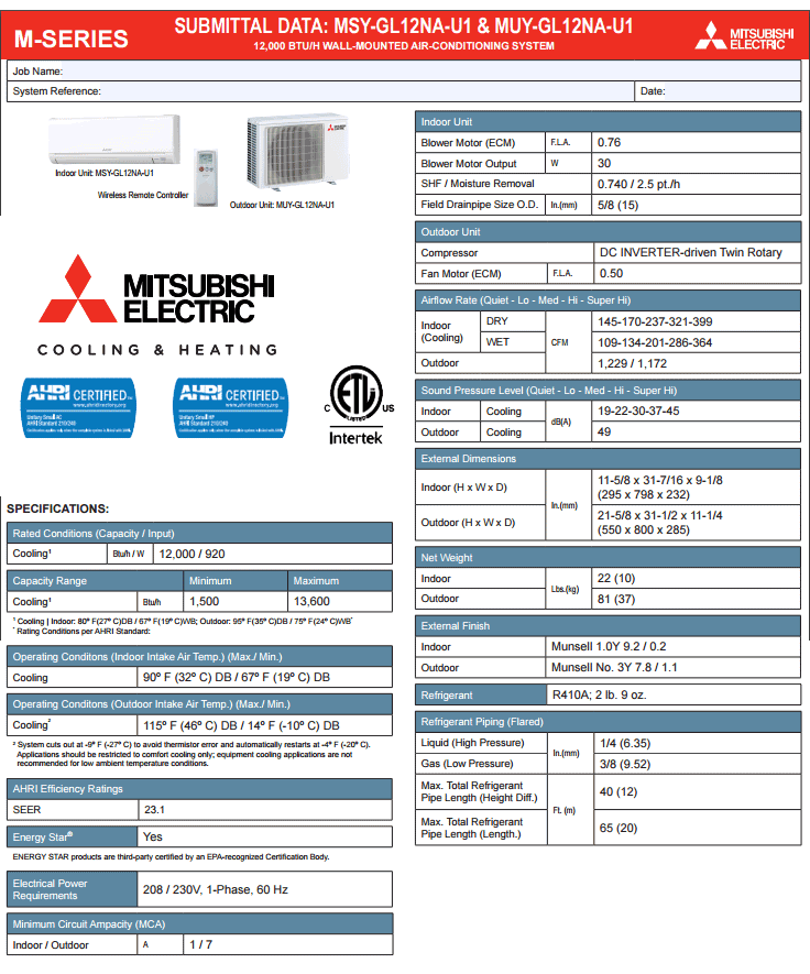 Mitsubishi MSYGE12NA9 MUYGE12NA2 Ductless Split system SEER 20.5
