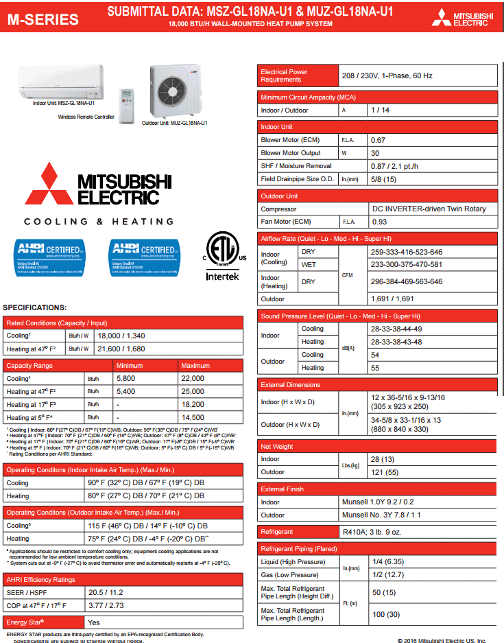 Mitsubishi MSZ-GL18NA-U1 MUZ-GL18NA-U1 Ductless Split system SEER 20.5 ENERGY STAR