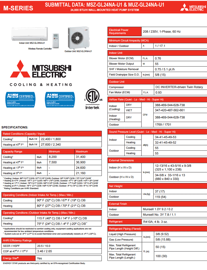 Mitsubishi MSZ-GL24NA-U1 MUZ-GL24NA-U2 Ductless Split System SEER 20.5 ENERGY STAR COOL & HEAT