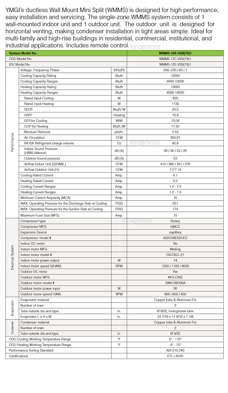 YMGI 12000 BTU DUCTLESS MINI SINGLE ZONE SPLIT AIR CONDITIONER 21 SEER WMMS-12K-V2B(78)1