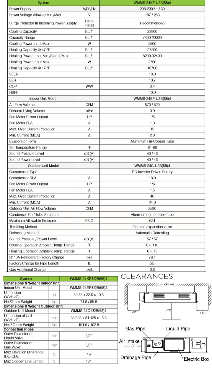 Product Name : YMGI 24000 BTU 2 Ton Recessed Fan Coil Mini Split Air Conditioner Ductless Heat Pump WMMS-24KF-U2B(58)4
