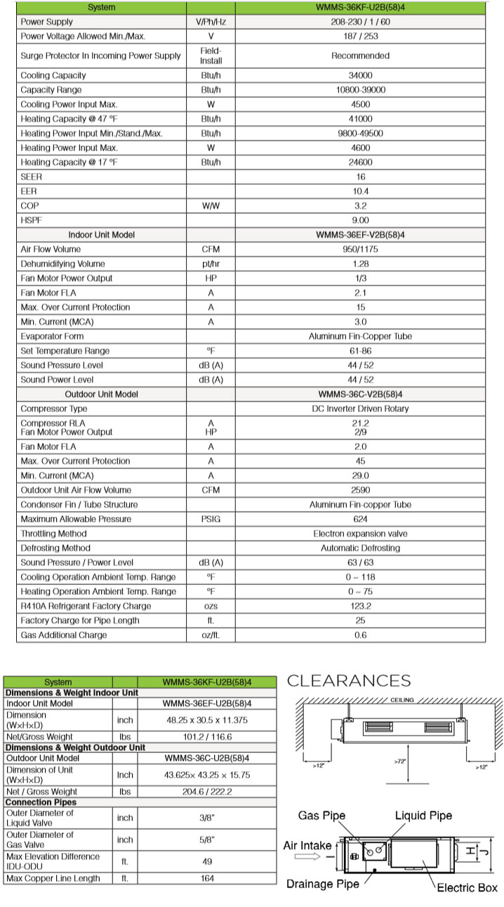 Product Name : YMGI 36000 BTU 3 Ton Recessed Fan Coil Mini Split Air Conditioner Ductless Heat Pump WMMS-36KF-U2B(58)4