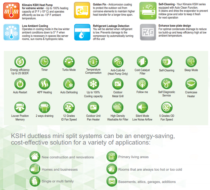 Klimaire KSIH Heat Pumpfor extreme winter - Up to 100% heating capacity at 5º F (-15º C) and operates efficiently as low as -13º F ambient temperature.