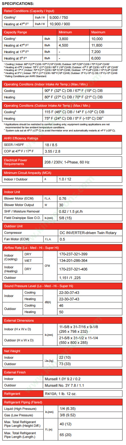 **9,000 Btu Mitsubishi SEER 18 Split Air Conditioner Heat Pump MZ-HM09NA MUZ-HM09NA2- MSZ-HM09NA
