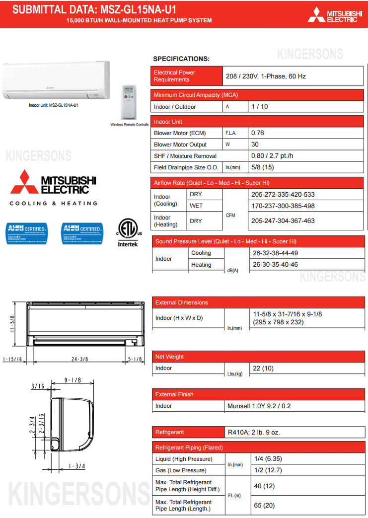 Mitsubishi MSZGL15NA-U1 Ductless Split Wall-Mounted Heat Pump 15000BTU