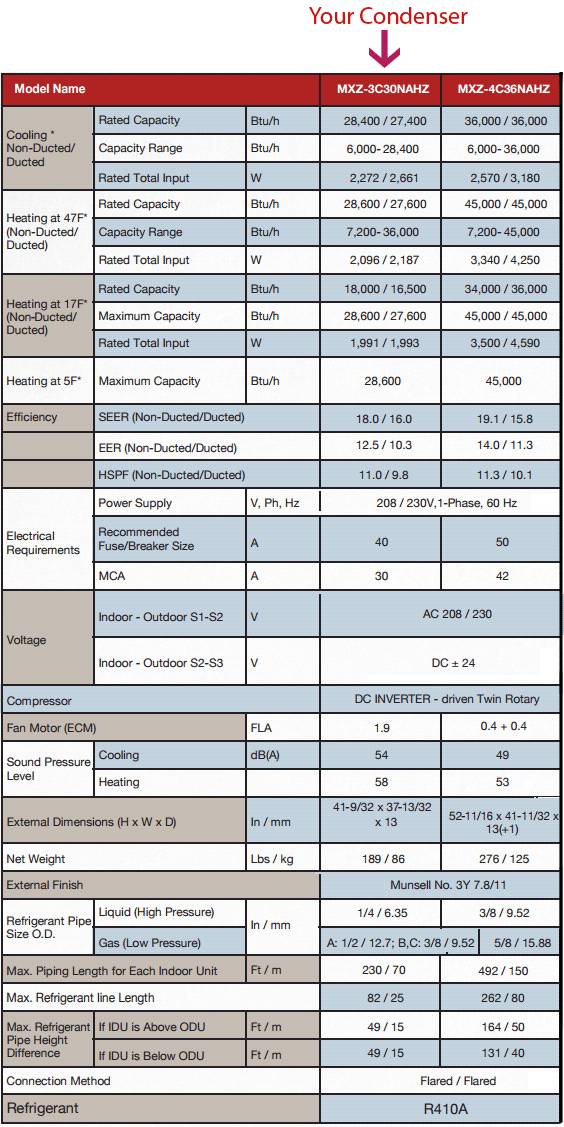 Product Name : Mitsubishi MXZ-3C30NAHZ2-U1 MXZ-3C30NAHZ 30,000 BTU HYPER HEAT Multi Zone Mini Split Condenser SEER 18 - SEER 16