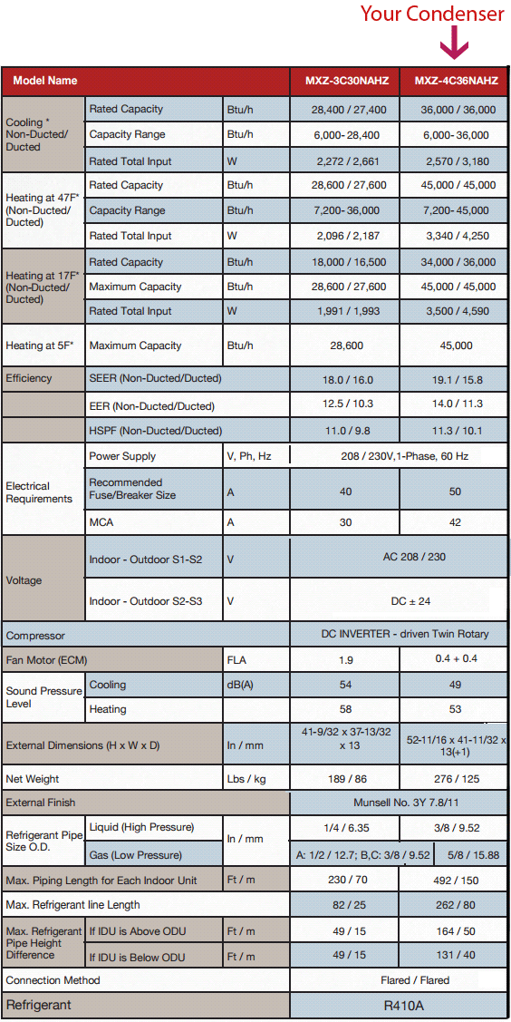 Low and negative ambient temperatures don't bother the MXZ-3C30NAHZ. It is rated for 100% heating capacity at 5 degrees F and continues to provide heating in outdoor conditions as low as -13 degrees F.