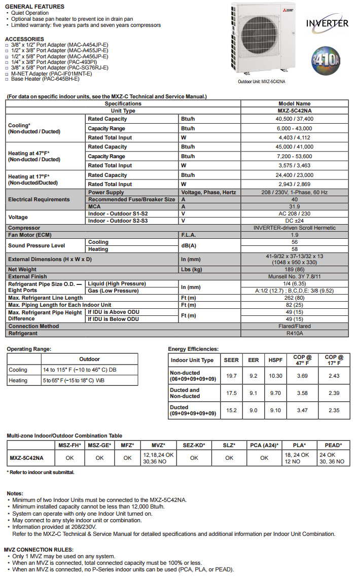Product Name : Mitsubishi MXZ-5C42NA2-U1 MXZ5C42NA 42,000 BTU Multi Zone Ducltess Heat Pump Condenser