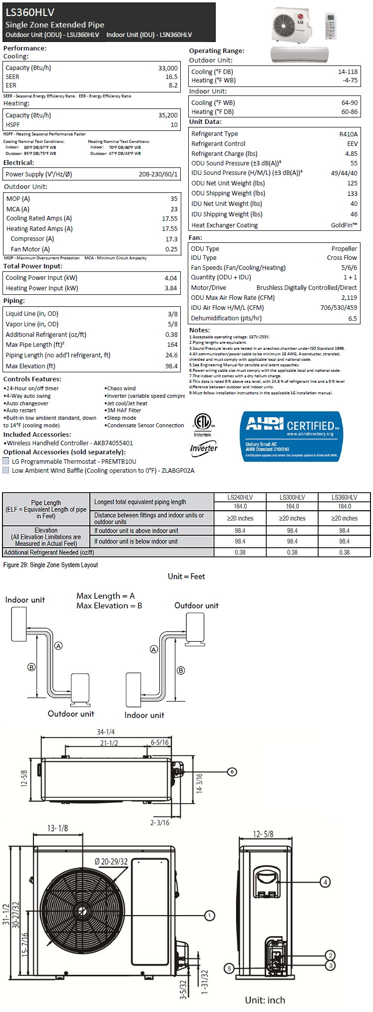 LG LS360HLV Extended Pipe Unit 36,000 BTU Ductless Heat Pump System 16.5 SEER Includes LSN360HLV & LSU360HLV