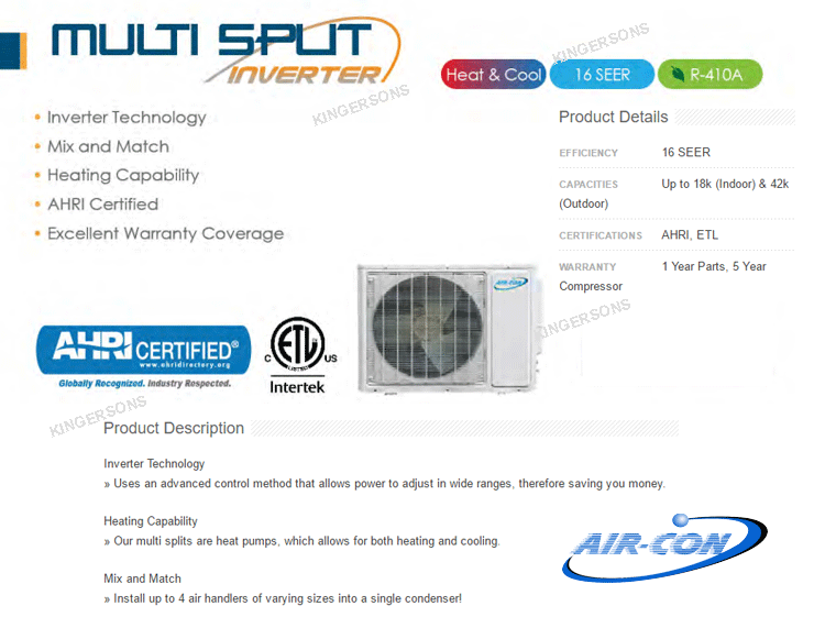 Description » DC Inverter technology uses an advanced control method that allows power to adjust in wide ranges, therefore saving you money » Units come in 9k, 12k, 18k and 24k Btu, allowing you to choose the most appropriate one for your need » These units are ETL Verified. » Installation kit includes 15 feet of copper tubing and insulation. » These units come with a 5 year limited warranty on the compressor and a 5 year warranty on all electrical parts