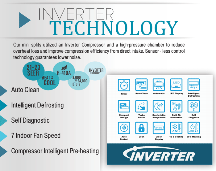Air-conditioners bearing the inverter tag use a variable-frequency drive to control the speed of the motor and thus the compressor. The variable-frequency drive uses a rectifier to convert the incoming AC current to DC and then uses pulse-width modulation of the DC current within an inverter to produce AC current of a desired frequency. The AC current is used to drive a brushless motor or an induction motor. As the speed of a brushless motor is synchronised to the frequency of the AC current, it is thus possible to build a compressor that can be run at different speeds. Similarly, the voltage and frequency can be varied as needed to efficiently run an induction motor at different speeds. A microcontroller can then sample the current ambient air temperature and adjust the speed of the compressor appropriately.