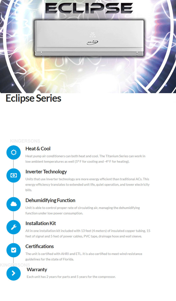 Description » DC Inverter technology uses an advanced control method that allows power to adjust in wide ranges, therefore saving you money » Units come in 9k, 12k, 18k and 24k Btu, allowing you to choose the most appropriate one for your need » These units are ETL Verified. » Installation kit includes 15 feet of copper tubing and insulation. » These units come with a 5 year limited warranty on the compressor and a 5 year warranty on all electrical parts