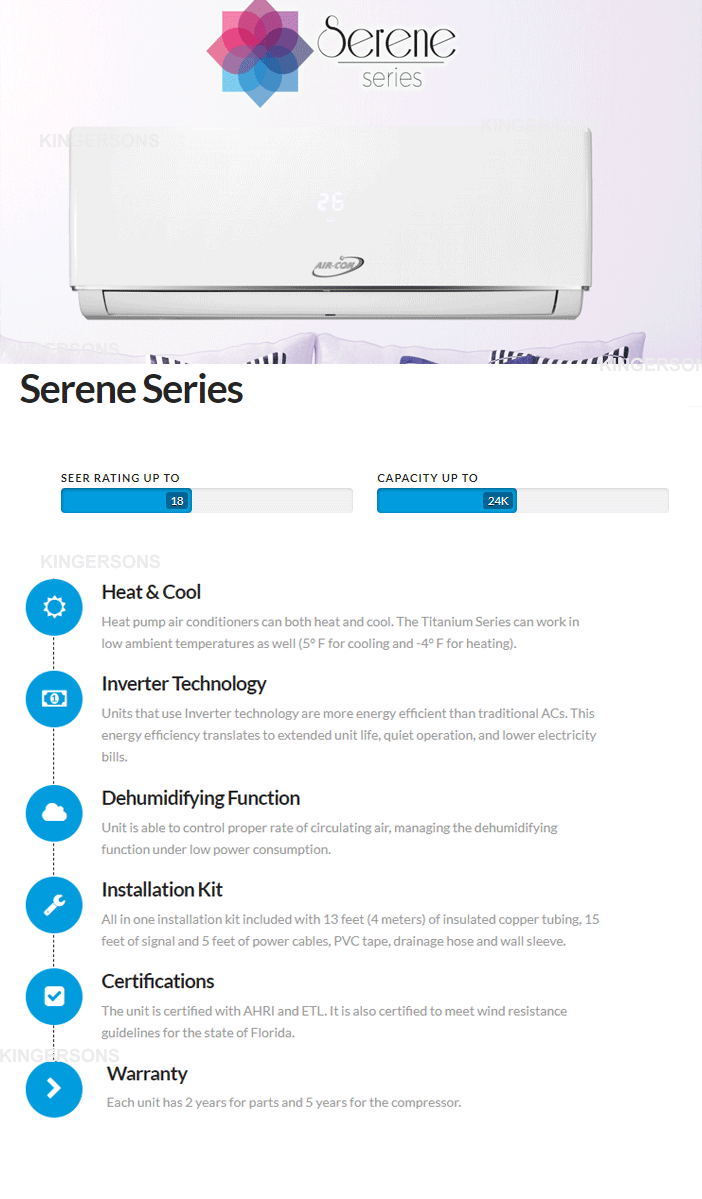 Aircon SERENE SERIES DC INVERTER Ductless Split System 18000 Btu SEER 18 Heat Pump ASRCI/EM4H4S18