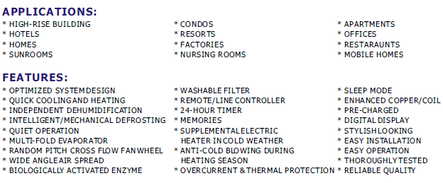 Split Ductless Systems: (DC inverter and fixed speed) split wall mounted, ceiling mounted cassette, floor mounted free standing, ceiling/floor mounted universal...WMMS Packaged Ductless Systems: mini wall mount packaged unit, portable AC/HP, PTAC/PTHP, air source heat pump (water chiller and heater, roof top.... Split Indoor Units: Horizontal flow and upflow fan coil units...SFCU Special Condensing Units: side-discharge compact foot-print SHCR, through-the-wall TTWC
