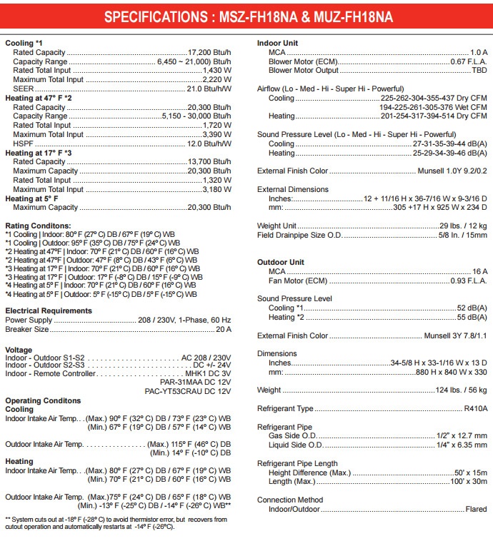 Product Name : Mitsubishi MUZFH18NA2 MSZFH18NA 18000 BTU SEER 21 Hyper Heat Ductless Heat Pump