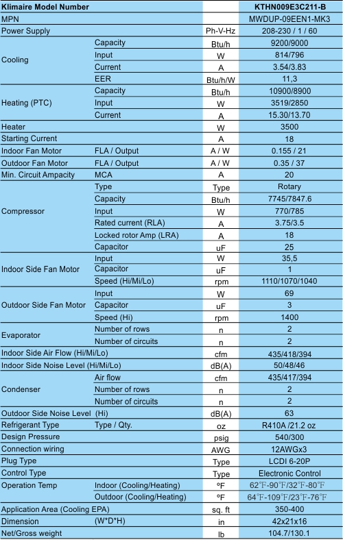 Product Name : Klimaire PTAC KTHN009E3C211-B With Electric heat