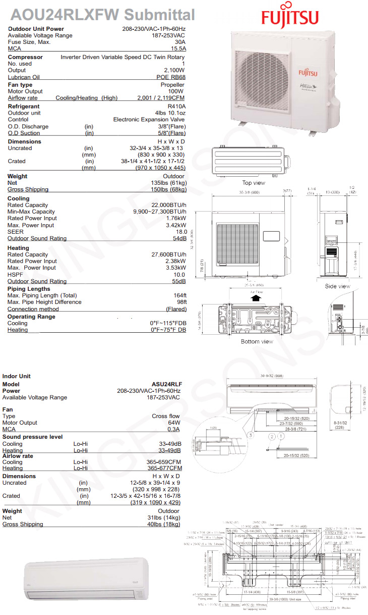 Product Name: AOU24RLXFW ASU24RLF Fujitsu 22000 BTU 18 SEER Wall Mounted Ductless Single zone