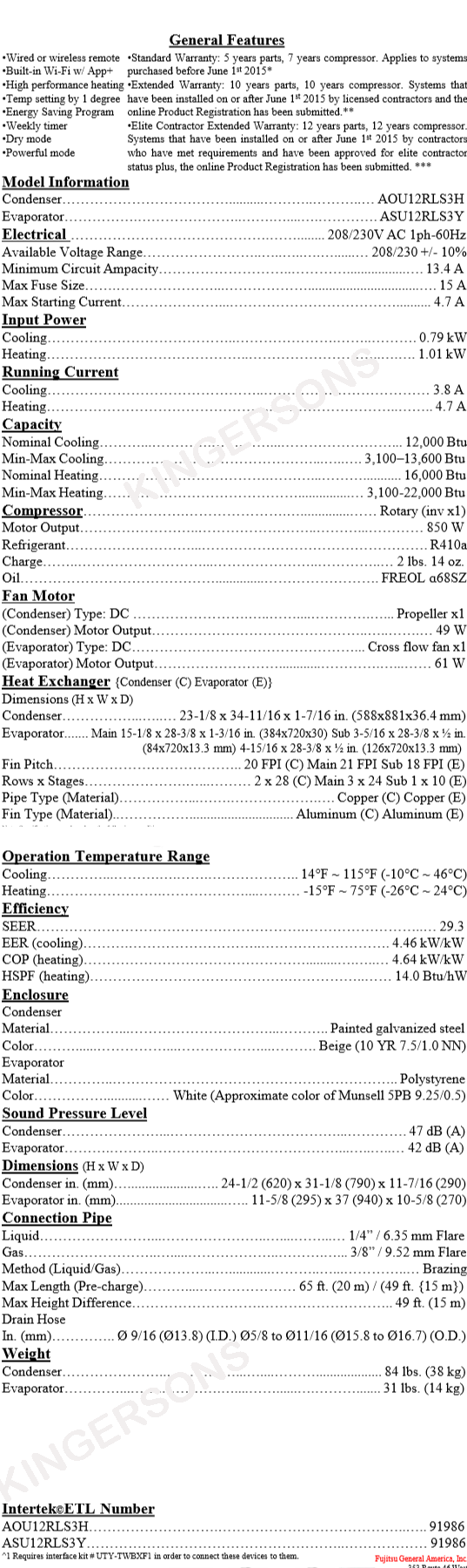 Product Name : Fujitsu 12RLS3HY - 1 Ton 12,000 BTU Cooling Heating - Wall Mounted Air Conditioning System - 29.3 SEER XLTH HYPER HEAT Low Temp Heating built-in Wi-Fi ASU12RLS3Y AOU12RLS3H