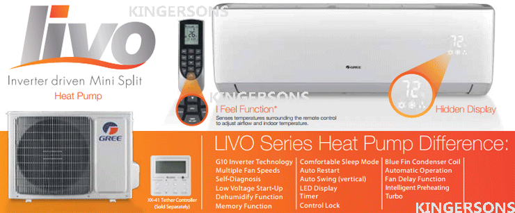 GREE LIVS24HP230V1A Livo Single Zone Ductless Mini Split System with Inverter Heat Pump, 24,000 BTU, 230/208 Volt, 16.0 SEER, Includes Indoor Wall Unit with Remote and Outdoor Condenser Buy From Kingersons.com QUIET, EFFICIENT AND OH-SO-SOPHISTICATED. Slim, stylish and elegant, the new Livo high wall units are the latest addition to the Gree comfort family. These 16-SEER heat pump systems are built around Gree’s G10 Inverter and variable compressor technology, using environmentally friendly R410A refrigerant. Each Livo mini split indoor unit is designed to heat and cool a single room, and will blend seamlessly into any decor. The unobtrusive front panel features a virtually hidden digital LED display, and the unit operates quietly, day after day.