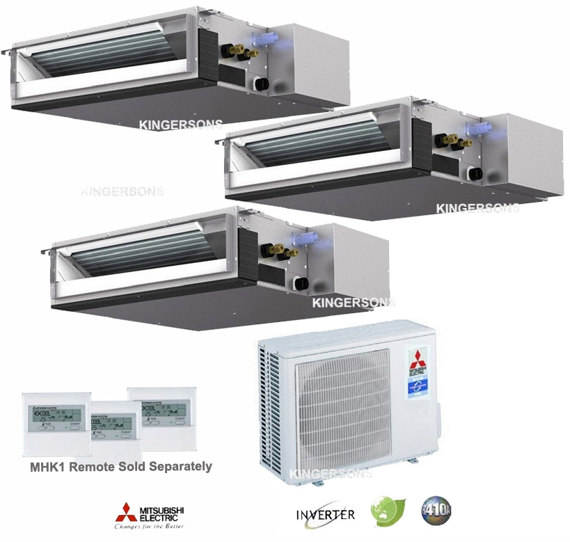 Mitsubishi MXZ3B30NA+SEZKD09NA4+SEZKD12NA4x2 Mr. Slim Concealed Duct Tri Zone Mini Split Heat Pump System - 33000 BTU. Includes (1) MXZ3B30NA 30000 BTU Outdoor Unit, (1)SEZKD09NA4 9000 BTU Indoor Unit, (2) SEZKD12NA4 12000 BTU Indoor Units and (3) Wired R