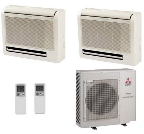 Mitsubishi MXZ2B20NA+MFZKA09NA+MFZKA12NA Mr. Slim Floor Standing Dual Zone Mini Split Heat Pump - 21000 BTU. Includes (1) MXZ2B20NA 20000 BTU Outdoor Unit, (1) MFZKA09NA 9,000 BTU Indoor Unit, (1) MFZKA12NA 12,000 BTU Indoor Unit |