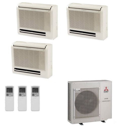 Mitsubishi Mr. Slim Heat Pump Floor Mounted System, Includes (1) MXZ-8B48NA 48,000 BTU Outdoor Condenser, (1) MFZ-KA12NA 12,000 BTU Floor Mounted Indoor Unit, (2) MFZ-KA18NA 18,000 BTU Floor Mounted Indoor Units and (3) Wireless Remote Controllers.