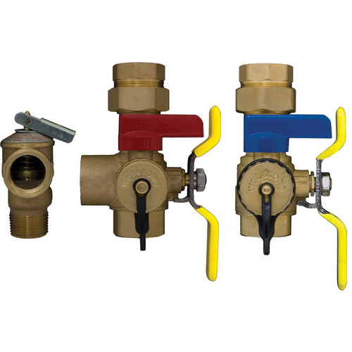 Tankless Water Heater Service Valve, Pipe Size 3/4 In., Body Material Brass, Pressure Range 398 to 500 psi, Temp. Range 100 to 180 Degrees F, Seat Material PTFE, Handle Material Vinyl Covered Steel, Seal Material PTFE