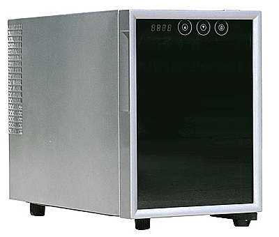ThermoElectric Technology · Environment friendly 6 standard bottles capacity with 2 removable shelves. Mirror glass door with platinum trim and cabinet reflects a contemporary look. Touch sensitive control panel with LED temperature display on door. ThermoElectric Technology (no compressor) offers a quiet operation with no vibration. Adjustable temperature between 44 to 66°F.