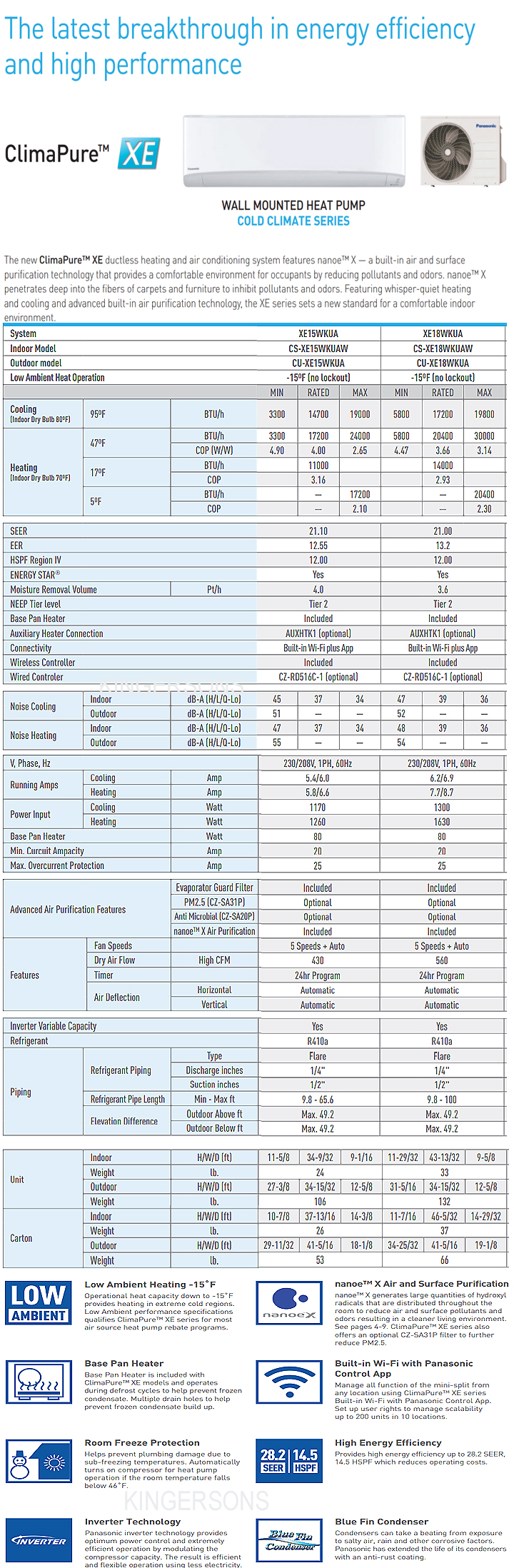 Product Name : 18,000 BTU Panasonic Cool & Heat Wall Mount SEER 21 Single Zone Ductless Split System HYPER HEAT