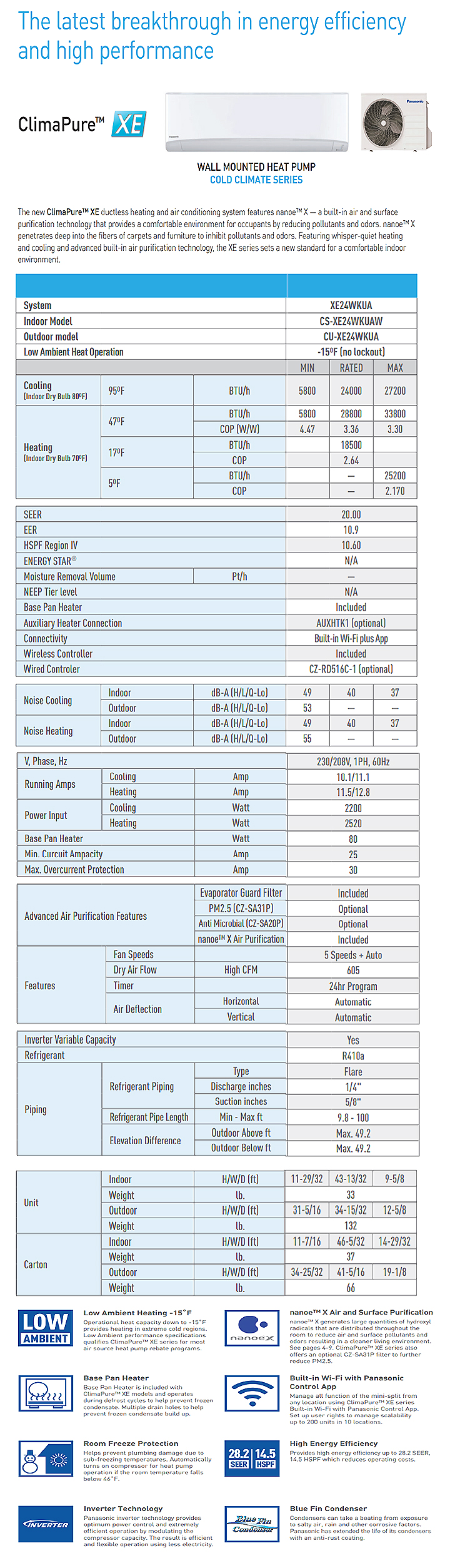 Product Name : 24,000 BTU Panasonic Cool & Heat Wall Mount SEER 20 Single Zone Ductless Split System HYPER HEAT