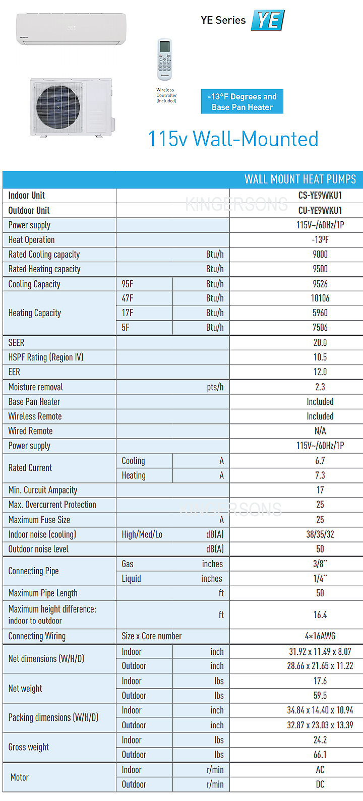Product Name : 9,000 BTU Panasonic Cool & Heat Wall Mount SEER 20.0 Single Zone Ductless Split System 115V HYPER HEAT