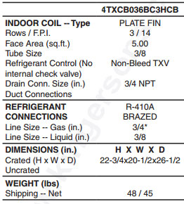 American Standard Coil - 4TXCB036BC3HC SPECIFICATIONS