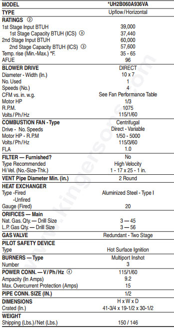 AMERICAN STANDARD FURNACE AUH2B060A9V SPECIFICATIONS: