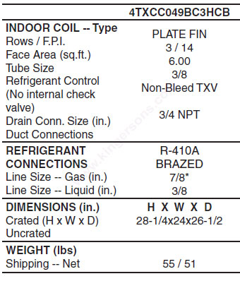 American Standard Coil - 4TXCC049BC3HC SPECIFICATIONS