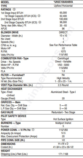 AMERICAN STANDARD FURNACE AUH2C100A9V4 SPECIFICATIONS: