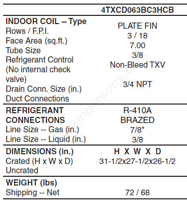 American Standard Coil - 4TXCD063BC3HC SPECIFICATIONS