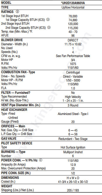 AMERICAN STANDARD FURNACE AUH2D120A9V5 SPECIFICATIONS: