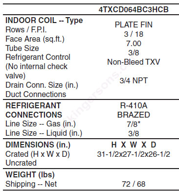 American Standard Coil - 4TXCD064BC3HC SPECIFICATIONS
