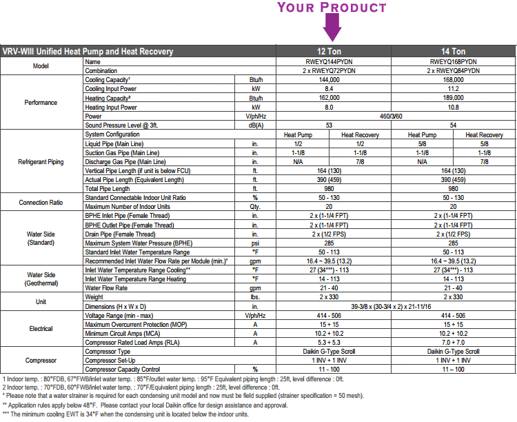 ** EWT in simultaneous heating and cooling operation can be lower than 48°F if the condenser is in heating dominant heat recovery operation. (contact your local Daikin office for further details)