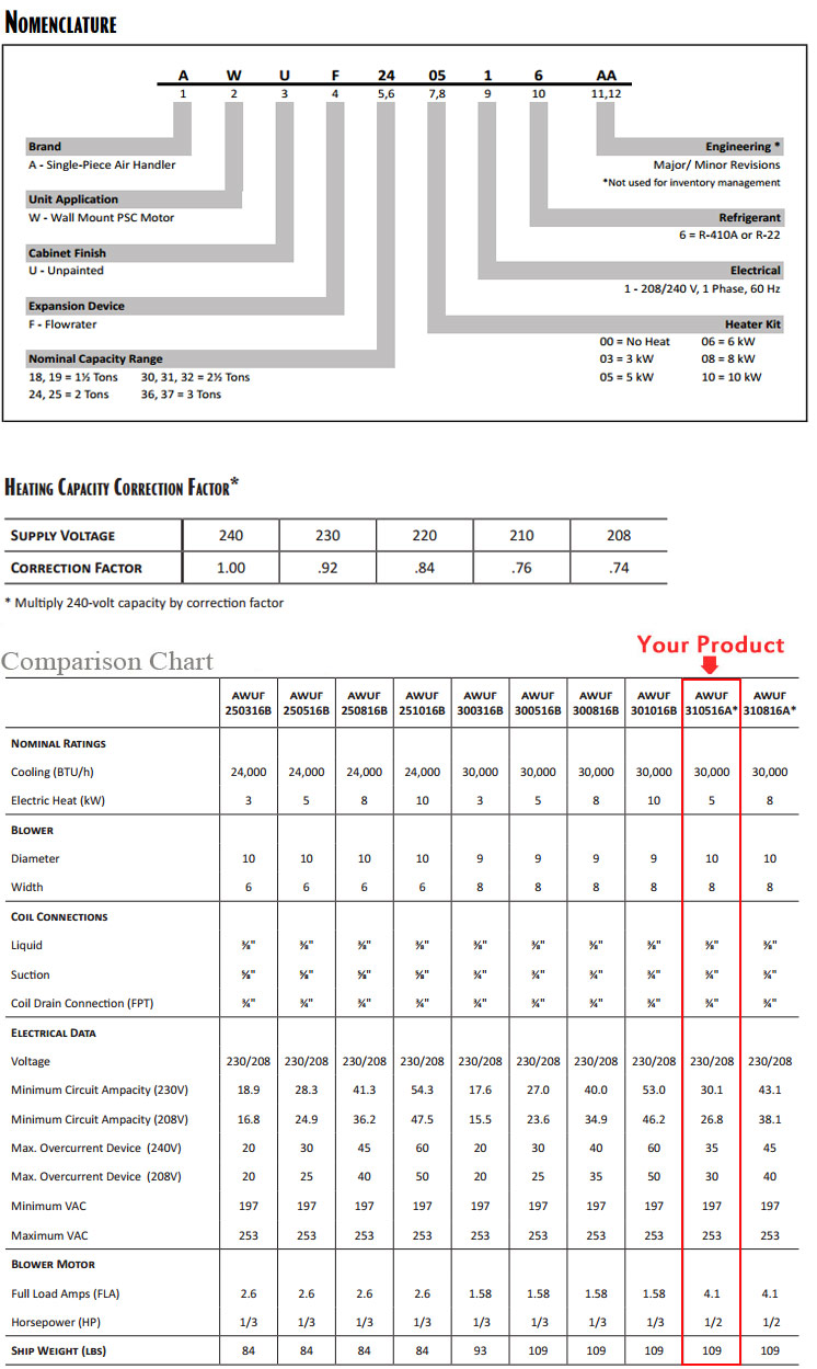 Standard Features • Equipped with a Check Flowrater for cooling-only and heat pump operation • Direct-drive, multi-speed motors allows air volume variation for heating/cooling – Multi-speed ECM: AWUF19, 25, 31, 32, 37 – Multi-speed PSC motor: AWUF18, 24, 30, 36 • Sequence-controlled, rust-resistant nickel chromium heating elements of 3, 5, 8, and 10 kW • Factory-installed pull-type disconnect • Aluminum tubing coils on all models • AHRI Certified • ETL Listed • Thermoplastic drain pan with bottom primary and secondary drain connections • Built-in filter rack (filter included) • Large chassis (2½- and 3-ton units) – front return only • Small chassis (1½- and 2-ton units) – front or bottom return • Wall-hanging bracket provided