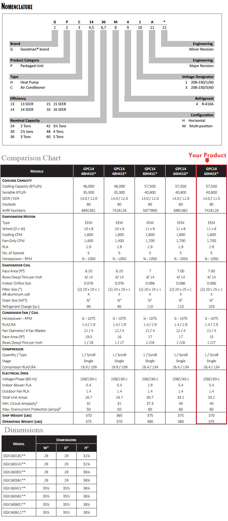 Product Name : 5 Ton Goodman GPC1460H41E SEER 14 Package Cooling Air Conditioner