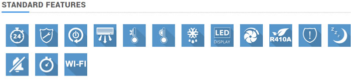 High Density Filter Mute operation Double level air flaps Anti cold air Turbo Operation Two direction airflow Sleep mode 12 Grades indoor fan speeds Louver position memory function Auto restart Timer Two-way draining connection Self diagnosis funtion Refrigerant leakage detect Emergency using function