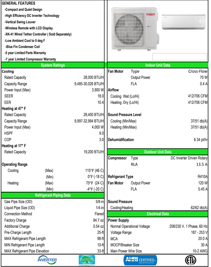 Product Name: 30000 Btu TOSOT 220V SEER 18 Wall Mount Ductless AC HEAT PUMP KTW30HQ2C2DFL