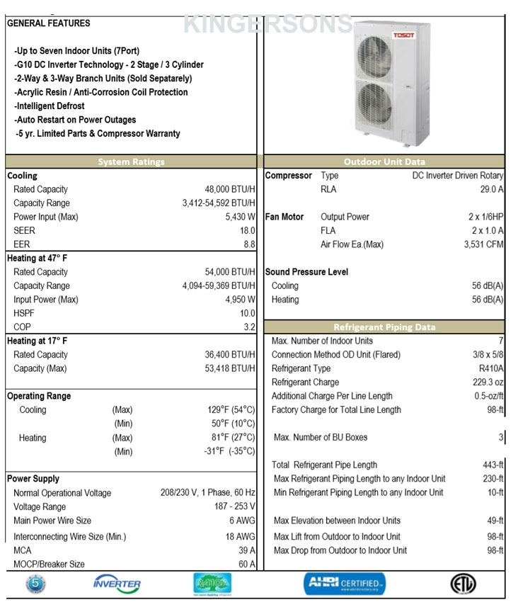 Product Name : TOSOT TM48H50 2-7 Zone Outdoor Condenser Unit 48,000 BTU, 230/208V, SEER 18 Inverter