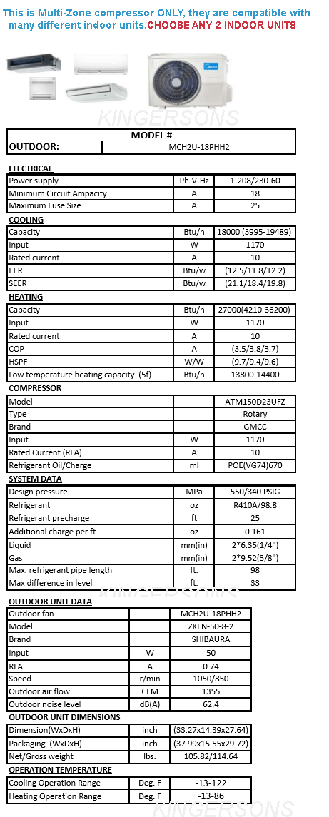 MIDEA PREMIER HYPER SERIES 18,000 BTU Outdoor unit ONLY MCH2U-18PHH2 for DUAL ZONES