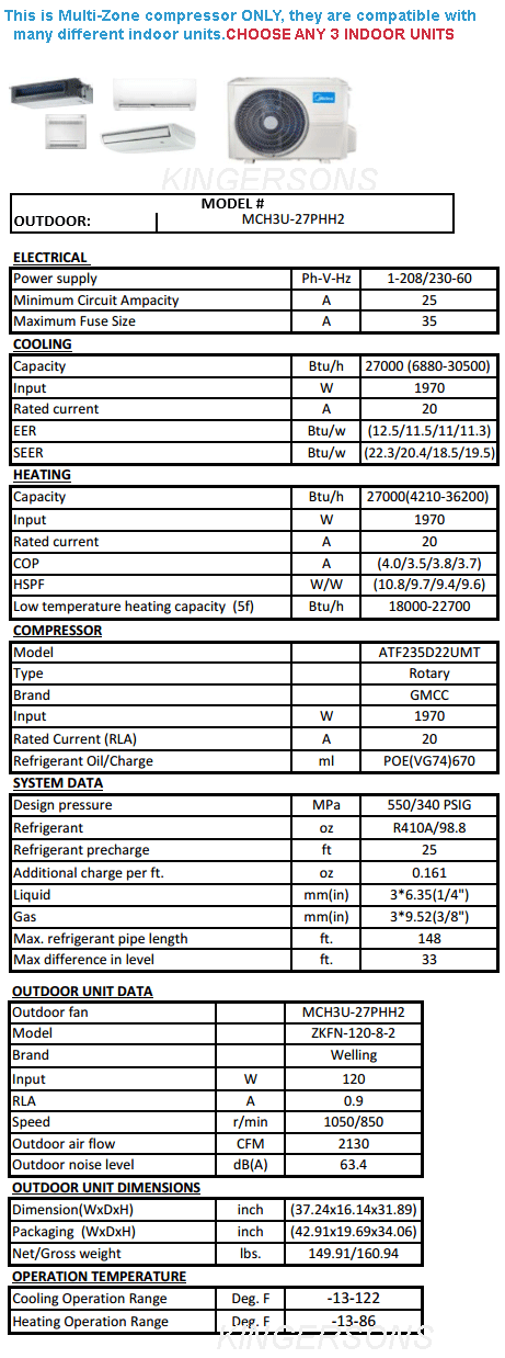 MIDEA PREMIER HYPER SERIES 27,000 BTU Outdoor unit ONLY MCH3U-27PHH2 for TRI ZONES
