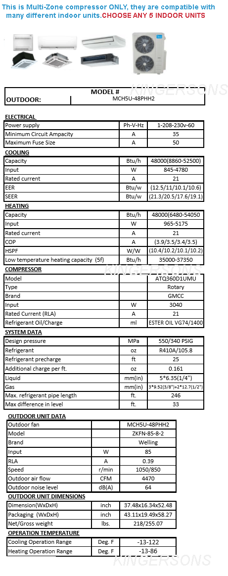 MIDEA PREMIER HYPER SERIES 48,000 BTU Outdoor unit ONLY MCH5U-48PHH2 for FIVE ZONES