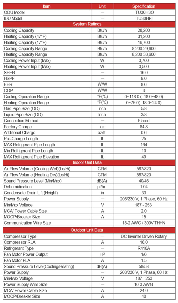 Product Name : 30000 BtuH TOSOT 230V SEER 16 Duct Cool & Heat Pump Ductless System 2.5 Ton